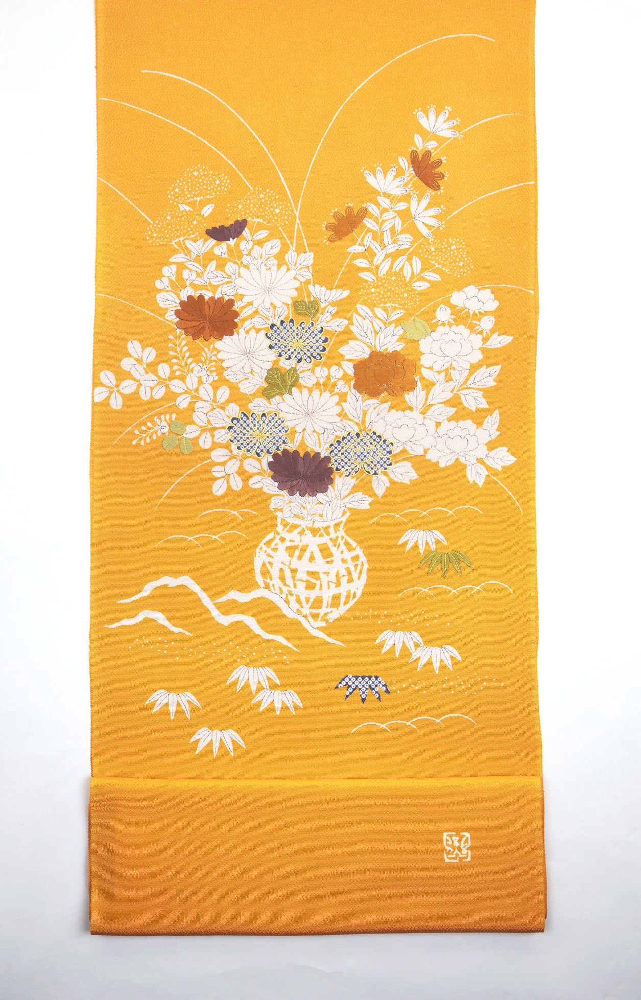 ぎをん齋藤の御所解染名古屋帯には、全て汚れ防止の対処法として【クリスタルガード】という特殊な加工〈生地負担がかからない程度〉が施してあります。