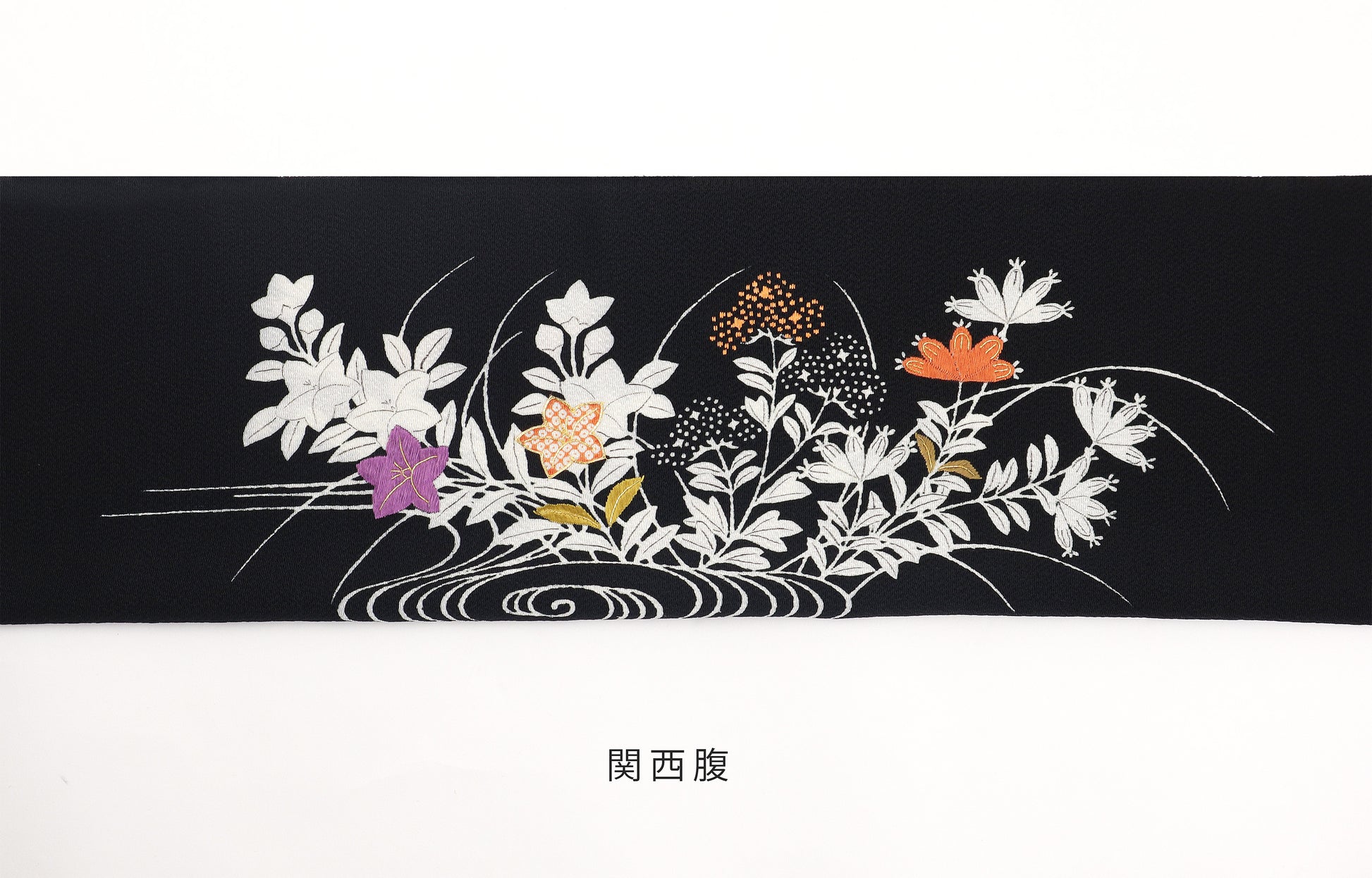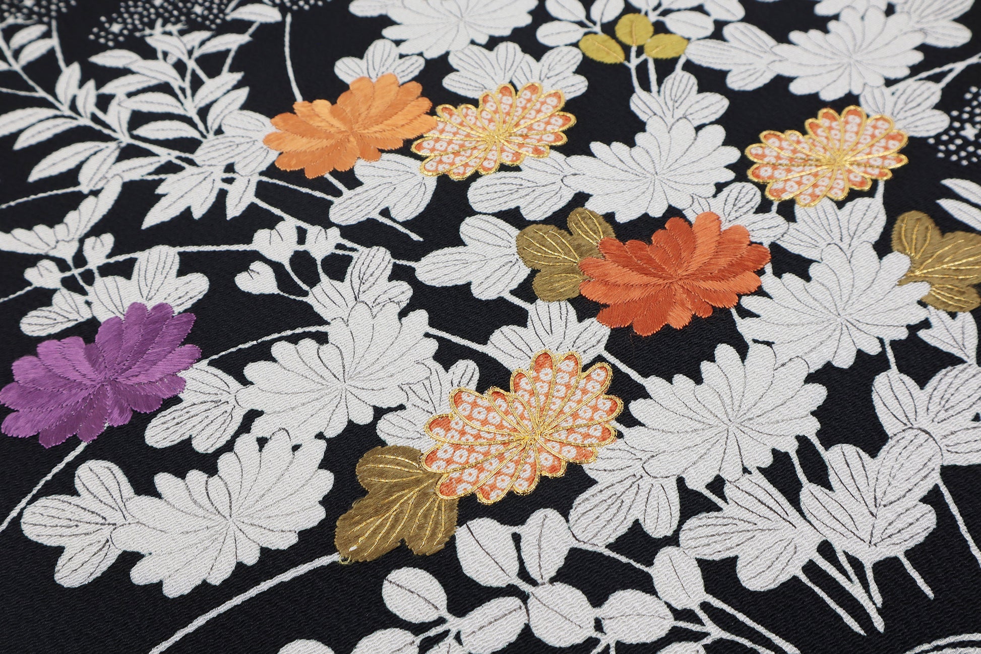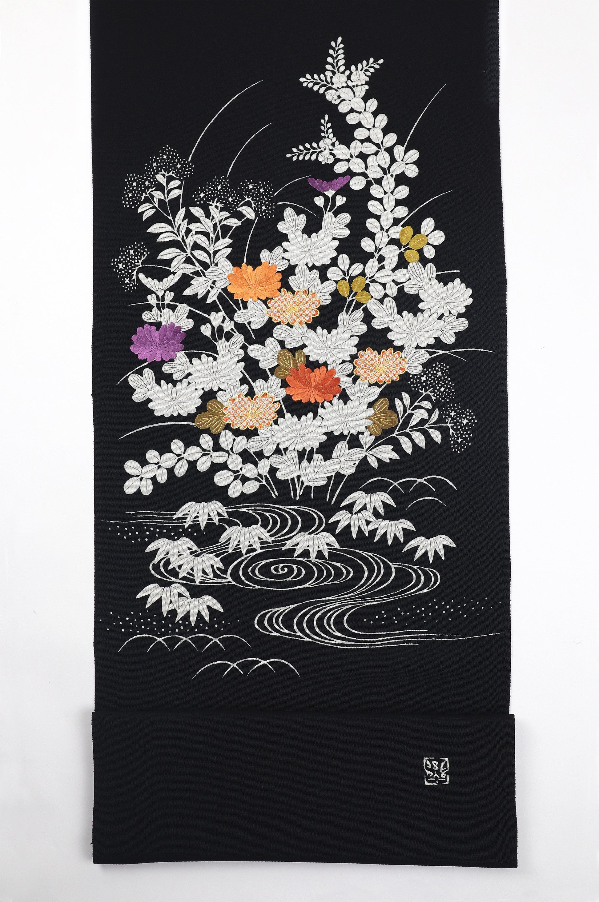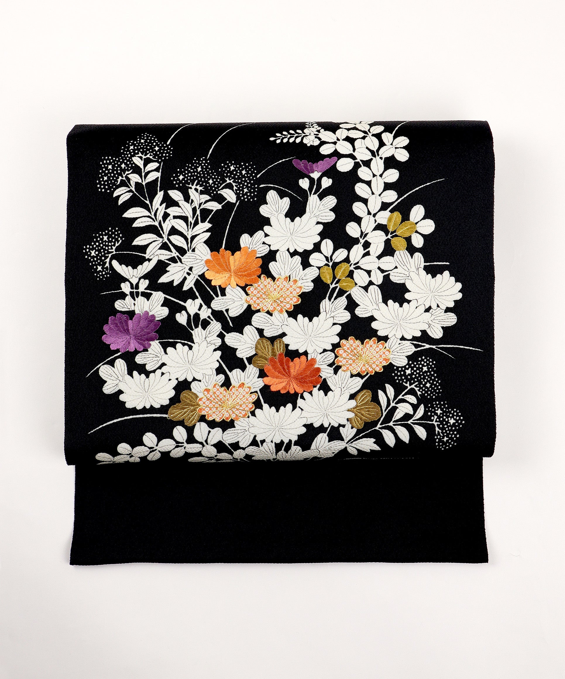 縮緬 御所解帯 黒地 秋草尽くし No.82831
